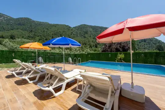 Dış mekanda ise, yemyeşil doğanın eşlik ettiği geniş bir havuz terası, rahat bir oturma grubu, özel barbekü alanı ve keyifli anlar için şezlonglar bulunmaktadır. Sevdiklerinizle doğanın tadını çıkarırken huzur dolu vakitler geçirebilirsiniz.