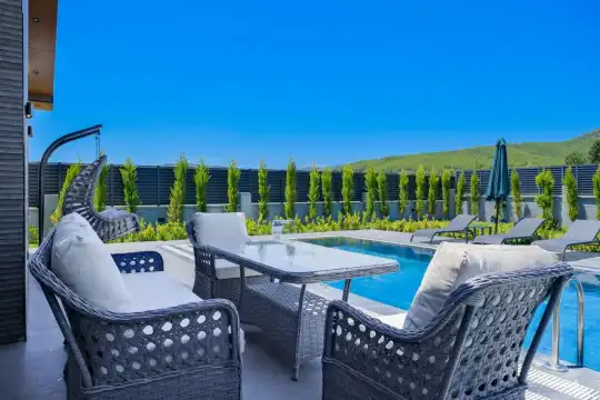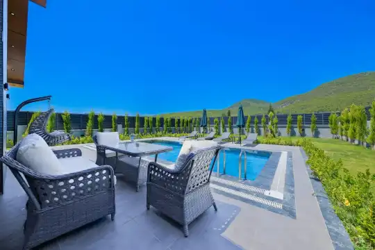 Villamız, yemyeşil doğayla iç içe, sakin bir konumda yer alır. Havuz başında güneşlenmek, kitabınızı okumak veya sevdiklerinizle keyifli anlar geçirmek için ihtiyacınız olan her şey düşünülmüştür. Geniş havuz terasında kapasiteye uygun şezlong takımı, konforlu oturma grubu ve enfes lezzetler hazırlayabileceğiniz bir barbekü alanı bulunmaktadır.