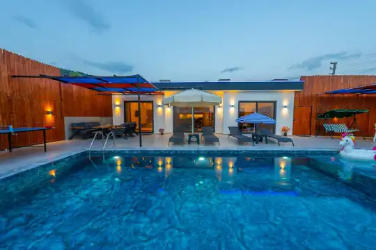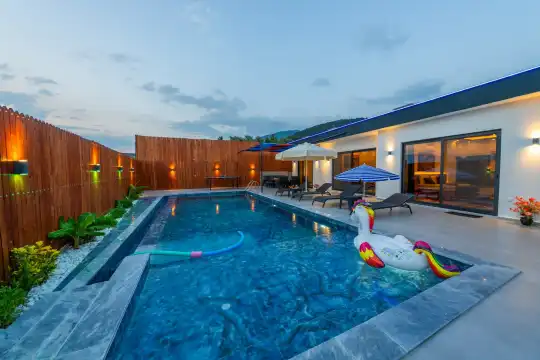 Villanın geniş bahçesinde şezlong takımı, salıncak, çocuk oyun ekipmanları, oturma grubu ve barbekü alanı bulunmaktadır. Konforlu oturma odası ve tam donanımlı açık mutfağı, tatiliniz boyunca ev rahatlığını yaşatır. Birinci yatak odasında çift kişilik yatak, ebeveyn banyosu ve jakuzi; ikinci yatak odasında ise bir çift kişilik yatak, bir tek kişilik yatak ve banyo mevcuttur.